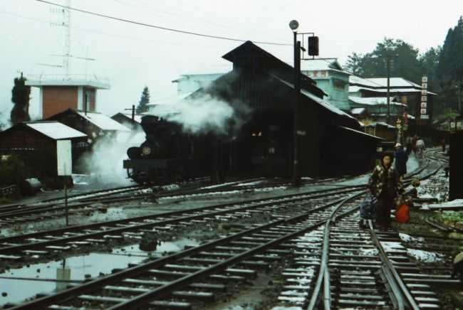 煙を吐いている蒸気機関車がいる機関庫の写真は、阿里山駅で47年前の1978年 に撮ったものです。当時は、阿里山駅からさらに先に行くときは、蒸気機関車が牽引していました。この写真を撮った日は、朝起きたら雪が積もっていました。