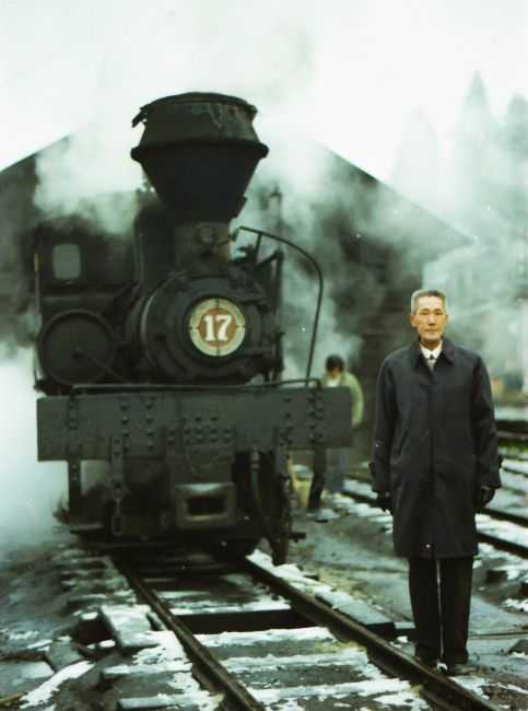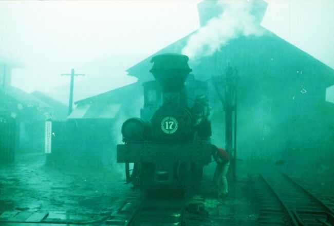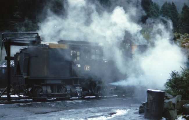 台湾鉄道嘉義駅から 71.9km 、標高差で 2244m 、平均勾配 50 ‰の阿里山森林鉄道を 6 時間ほどかけて阿里山駅までやってきました。霧が出ていて、 霧の中から突然蒸気機関車の引く列車が通り過ぎていきます。 機関車の下の灰を清掃する作業を女性の作業員が行っていました。 その日は、 阿里山森林鉄道の蒸気機関車の元機関士の方の家に泊めていただき、「竹葉青」という中国のお酒を飲ませていただきました。 17 号機の横で直立不動の姿で写っている写真の人がその機関士です。次の日、 朝起きると、雪が積もっていました。 2 シリンダーの 17 号機が煙を出していました。