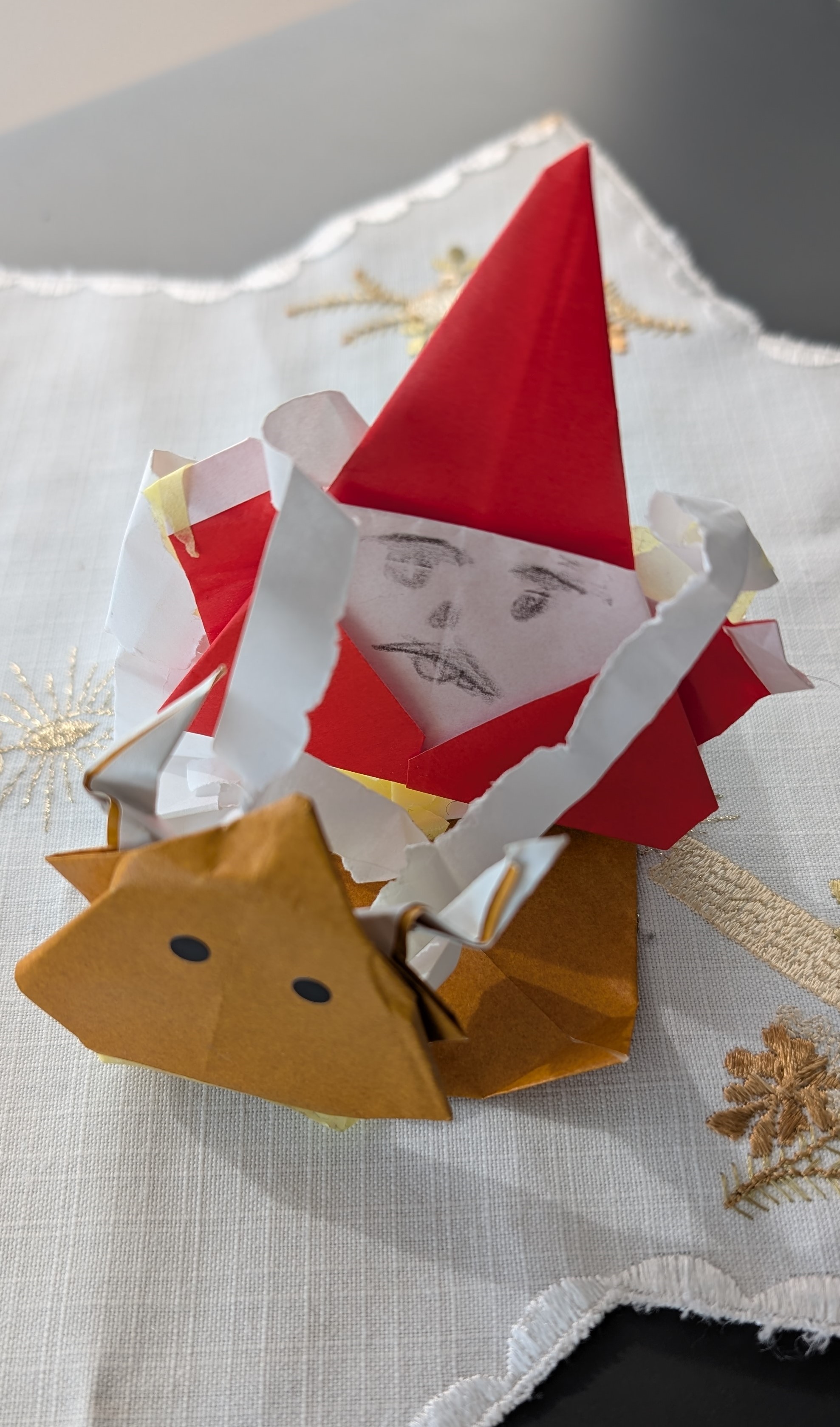 昨日22日は、通常ならなんでもない日ですが、我が家ではクリスマスのお祝いデーでありました。なにしろ、今年はイブが火曜でクリスマスは水曜。中学受験間近のお姉ちゃんは、毎晩遅くまで塾があり、そんなウィークデーにとてもじゃないけど、クリスマスを祝えない。そういうことで22日。そんな家庭は多かったのでは 毎年、私がケーキを作って、ローストチキンとブロッコリークリスマスツリーで祝うんですが、今年はケーキは自家製ティラミスに変更。ローストチキンは、どうも最近市販の物は味が落ちている印象なので、我が家のオーブンで焼くことに。バーサマ、朝から一生懸命作りましたよ。 (6歳の孫が作った、トナカイとサンタさん)で、子供達には何よりも重大事項のサンタさんのプレゼント。どうやらパーティの日程変更に合わせて、親が「今年はサンタさん、予定変更で22日に来てくれる」と話したようで、前日の夜、6歳の孫の文字による「サンタさん、チビレゴをおねがいします。サンタさん、だ~いすき」という手紙が、ツリーに吊ってありましたっけ。 その数日前、「サンタさんはいい子の所にしか来ないんだよ、ランラン(6歳孫のあだ名)の所には、来てくれるかなぁ~」と意地悪いったら、黙っちゃって、下向いてジワジワ今にも泣きそうな顔になってしまって・・。どうやら、あまりいい子でなかった思いがあったらしい。 まずいまずい、と「ランランはいい子だから、大丈夫だよ。優しいし、わがまま言わないし。すぐに泣くところだけアレだけどね」と言ったら、「けんかしても、来てくれるかな」とまだ心配そう。「大丈夫、喧嘩なんかみんな、するよ」と答えてあげたら、ようやく安心した顔になってましたっけ。 小6のお姉ちゃんの方は、すでにサンタの正体を知っているようで、冷ややかなんですが、6歳のランランは、いつ頃までサンタさん来訪を楽しみにしてくれるのか。すでにオッサンの我が息子が、サンタさんの正体を知ったのは小学4年の時でショックで愕然としてましたけどね。 世間の親やジジババは、今年はどうしているのでしょうね。いずれにせよ、我が家のクリスマスは早めの終了となったのでした。