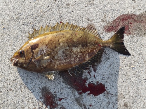 本日の釣果は・・・。今朝も早うから起きてからに・・・・。いつもの釣り場さ行ったでありんす・・・。(;^ω^)o/――~>゚))))彡釣り場のコンデションは今ひとつでありんした・・・。本命のクロダイ君はですな~ナカナカ来てくれはらしませんがな・・・。(;゚Д゚)!へてからに外道ばっかしでありんした・・・。(/ω\)てな訳で本日の釣果でありんす・・・。アイゴ君 ひとつ ボラ君 ひとつ クサフグくんなど・・・。