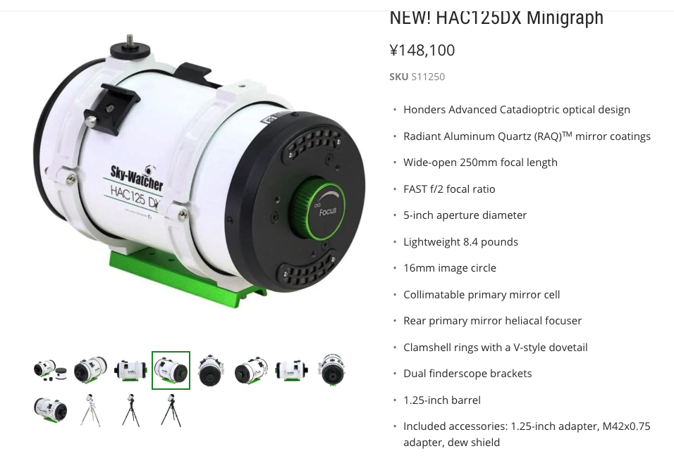 Sky-WatcherのUSAサイトを見たら、HAC125DXというのがあった。どうやら主鏡を前後させてピントを合わせる方式らしい。シュミカセみたいな方式。M42アダプターが付属されている。Tマウントで、それなりのカメラを使えるということらしい。日本向けは、接岸部のヘリコイドでピント合わせ。10mm前後って話だったと思う。主鏡がわでの移動量は、20mm程度はあるんだろう。接岸部で補正版アダプターから30mm程度の位置にピントがくるのに対して、Tマウントでピントを出すにはもう20mm前後が外にないとダメだから。私の記憶では主鏡と補正版の距離が大きく変わると、球面収差が大きくなったと思う。Tマウントを使ったら良像範囲が狭まり、実際にはイメージサークルが小さくなるんじゃないかな?メリケンの人達は、周辺までの両像にこだわりがないのかな?昔々、CONTAXのWG製レンズだと、絞り羽が絞るとノコギリ歯になっていた。Zeissの技術者曰く「光量は問題ないだろ」との回答だったらしい。当時、ピントの合わない前後のボケ味を言うのは日本人だけだったらしい。現在では、英語で「boke」が使われてるらしい。切った貼った画好きで、デカいものが正義!の大雑把なメリケンの人達はどう思ってるんだろうか?