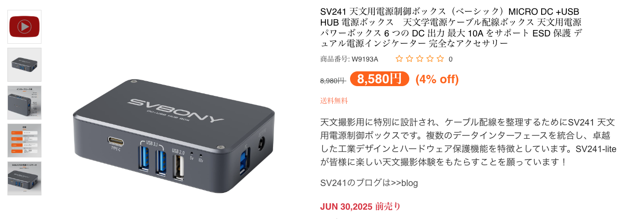 SVBONYから発売される電源制御BOXが微妙に気になる。私が自作している電源制御BOXとどう違うのか。USBハブ内蔵らしい。私は12Vになるように基盤を入れてるけど、こっちはストレートスルーという。でもなんか色々な保護回路が入ってるらしい。ちょっと気になる。1/4ネジ穴とM4ネジ穴があり、AsiAirみたいにファインダー取り付けとかを想定してるのかな?んー、私にしたらちょっと微妙かな?Prominar500だと、そんな場所ないし。今んところ不自由ないし。入力に12V10Aとちょっと太く用意するのも面倒かな。あっても設置場所に悩むかな?