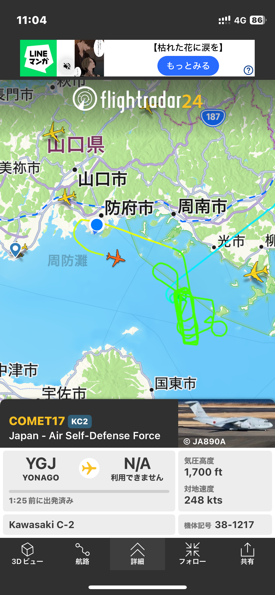 今日は休日出勤で疲れた。昨日防府であった展示飛行の撮影が終わって、ふとフライトレーダーに何かあるかなと見た。C-2の航路が出てた。ドレkライ前から飛んで待機していたのかわからないけど、ぐるぐる時間調整してたんだ。大変だなぁ。