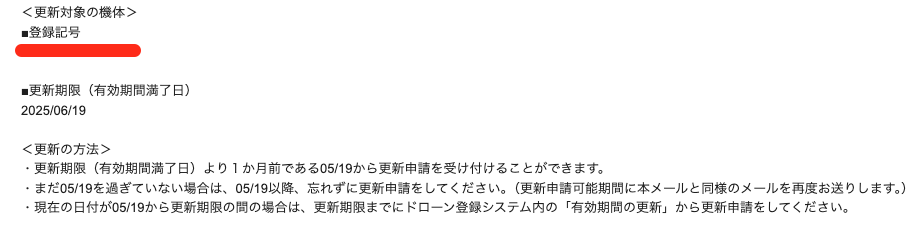 国土交通省航空局無人航空機登録制度担当からメールがやってきた。もう2年経ったんだ。でも更新しないよ。だってあのドローンはもう動かせないから。アプリで動くドローンはやっぱりダメだな。