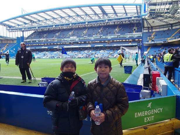 <12月26日> 今回の旅最初の観戦、チェルシーvsウェストハムユナイテッドに行ってきました。スタンフォードブリッジに来るのはこれで三回目。ところがー!昨日は「クリスマス休暇で電車が運休」と書きましたが、26日~30日まで工事のため?ほとんどの地下鉄が運休だということが昨日判明しました。で、Google Mapを駆使してバスをメインに移動を決意。実はこれが無茶苦茶大変でした… 地下鉄を使えば40分たらずで行けるはずのスタンフォード・ブリッジにバスで行こうとするとバス停が見つからず迷う、路線がGoogle Mapの通り進んでくれず迷うなどとんやわんや。余裕をもって試合開始一時間半前には着きたかったのですが(自分一人の時は二時間半前に着きたいところですが息子らを連れて行くとなるとトイレが心配。イギリスは日本と比べて街中で使えるトイレが少ないので)結局スタジアムに着いたのは試合開始一時間前を切ってました。 で、中に入り、席を確認し、記念撮影 スタジアムの雰囲気につかの間浸ってから試合開始モードへ。 この写真、何だかわかりますか?チェルシーの大旗の下です。業者にとってもらったのがゴール裏でしかも位置が向かって右下だったのでストライクで大旗の下に。屈辱です火つけようかくらいの感じでしたが思いとどまりました。 試合はチェルシー貫録の勝利でした。2対0でしたがボカスカ点を取るよりも確実性十分の貫録がありました。隙が無い(あれだけのメンバー揃えてりゃあそうだろうさ)お目当てのクルトワもほとんど出番がなく、数回触ったり蹴ったりしたくらい。 色々ありましたが一試合目、終わりました。
