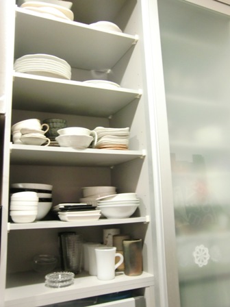 最近ゴミ箱導入といい、その後の奇跡の換気扇のお掃除サービス体験といい、キッチンを攻略しなさいと、誰かに言われているような気がして・・・というか、今までどうしていいかわからなかったキッチンを少しでも何か変わったらいいなと導入したゴミ箱が呼び水になってくれたのかな。ほんとにゴミ箱のおかげで私の心がけもしやすくて、全体的にいいかんじでキッチンが回りつつあります♪ただ、まだまだ殆どが中途半端のごちゃついたままです。あまり手をつけたくなかった・・・というか、手をつけて収拾つかなくなるのがイヤだったのでなかなか始められなかった食器棚の見直しを午後から着手しました。食器は高級なものは一切ありません、チープなもので揃えています。もともと家庭的なメニューしか作れないので、食器もおのずと雰囲気のでそうなしっくりくる和風が多いのも特徴です。でも少しずつはシンプルに使いまわせる白いもの、そしてモダンに見える黒い食器がちらほらあります。で、今までは、器の大きさや種類別にわけて収納してました。何も考えずに、小皿はここ、中皿はここ、コップはここ、という具合です。でも大きさは揃ってても、見た目の種類がさまざまなので、ちょっとね。ということで、これからは、素材とか、色見のグループで統一した収納に切り替えました。そうしたら今後食器を買い揃えたり、処分したりするのに新しい目安がわかるようになりました☆とりあえずこうなりました。今後数年間はこんなかんじで少しずつ手を加えようと思います。下段は 透明のグループ。ただ一番届きやすい場所にグラスがあったので、そこをガラス、透明のものの集まりにしました。といっても透明のものって少ないですね。。。結局入りきれてない他のものが混在。と、同時に、透明の食器を揃えていこうと思います♪下から2段目は、和洋中対応のシンプル白黒食器。もう少し黒の割合を増やしたいなと思っています。そしてよく使う食器たちになっています♪その上は和食器。ほんのり白いものもありますが、洋というには無理な和風の趣のあるものです。これも普段はよく使っていますが下の踏み台を通常はだしているので、1段上ればすぐに取り出せる位置です。でも色見はこれ以上極力増やさないようにしようと思います。上から2段目はプレート類。トーストのお皿や普段使ってるものは下の引き出しに立てていますが、そこに入りきらなかったもの。ということになります。ほぼ白っぽいものです。一番上はたまに使うもの。無印の大きなグラタン皿などになりました。こうやってみると、結局見た目は案外バラバラになりました。私の飾るテクニックが足らないのも大きな原因。でも個人的にはガラスの素材にはガラスをあわせたくなるし、思いっきり和食器にテカテカの真っ白プレートもおかしいなぁという感覚はあります。とってもオシャレな洋食器は我が家には不要だけれど、それとなくコーディネートできればいいかなと思います。なので、料理に合った好みのテイストで食卓がカバーできる食器をある程度一式そろえたいなと今後の楽しみが広がりました♪今日の料理によって選ぶ食器が一つのエリア内で納まる。そして、片付ける時も基本はそのエリアに大部分が収まるように。あちこちから取ってきて、あちこちにしまうことがなくなる?かな♪今回数種類処分箱にいれましたが、まだ迷ってるものは残しています。今後も使わないようなら思い切って処分しようと思います。そしてできた空間。今まではこの空間がとんでもなくもったいないと思っていました。棚をあげたり下げたりして、よくある棚を使ってみたり。カゴにいれてみたり。でもそれは結局私には使いにくかったのかな。。。食器を並べていき、大体の場所に棚を移動したら、結局入居当時の等間隔に戻りました☆しっかりと空間があることで奥のものも見渡せて取り出せます。あとはこのエリアごとに見直ししたり、買い足したりしていこうと私にしては分かりやすい収納になったみたい。お気に入りの食器がずら~っと見えるように並べるには難しい食器棚ですが、このひとつひとつのエリアが整頓されて統一されて、お気に入りのものが休む空間になればいいなと思います♪これからがスタートです。*** こちらの本を読んでやってみようと思いましたヨ♪ ***私は見せる収納が苦手なのですが、隠すと忘れてしまうので、オシャレに見せる収納ができればいいなぁ~と思います2011年05月【送料無料】パリで学んだ収納術にほんブログ村にほんブログ村にほんブログ村