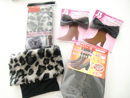 立て続けにいっちゃいます~!次にセリアで目に留まったのが、シューズ関連グッズです。こんなものたちを買いました。数年前からよく見かける、手持ちのブーツに取り付けるだけで雰囲気の変わるファーとかってありますね。ちゃんとしたもので1000円くらいするものもあって、それならいいわ~でした笑(どうしても値段から入る)100円でもちらほらみかけてましたが、ファータイプはちょっとクセがあるし、品質がダイレクトに分かりやすい。でも今日発見したのはモコモコアニマル柄☆でた!!アニマル柄はちょっと抵抗のある私。小物でも殆どもってませんが、これならって、またチャレンジしてみたくなりました。スタッズ部分が隠れていい感じでイメチェン♪そしてもう一つはシンプルな黒いリボン。こちらは、スタッズブーツには不向きなのでくにゃっとなるブーツに、淵がいびつなので折り返してから装着。ヒールがあればいいんだけど、ヒールが苦手なので、ラクチンブーツ(汗)でもまぁ似合うかな♪100円で1つなので、両方で2つ買う必要がありますが、200円で手持ちの靴のイメージチェンジができると安い☆しかも、冬場にブーツもめったにはかないので、めったにはかないものにいくらもかけられないけど、200円ならね♪イイカンジで秋冬が楽しみになりました♪他に見た感じ、ベルトを付け加えるタイプもありました。足元はそんなにジロジロ見られないので、案外ザツさも目立たないように思います♪(特にザツだというイメージは感じられませんが)3~4回で充分値段相当の仕事をしてくれる商品。気に入ったら、正規のしっかりした商品で見つけようと思います。あと下のほうに写ってるのが、ヒールアップパッドというもの。たしか、2センチ、3.5センチ、私のが4.5センチ?身長が高くなるアイテムです♪背が低い私には嬉しい。ちゃんとしたものはコチラも1000円くらいのものがあります。もちろんブーツや運動靴などしっかりかかとがあるものに使えます。そして小物は、一緒にGETしたレース調プラカゴに♪下駄箱にもすっぽり奥行き丁度のサイズです☆こうなるとやっぱり子供の靴などいれて、ズラリ感がほしくなるところですが、当分慎重に様子をみてガマンすることにします。妄想だけは膨らみます☆なんせ、今回のお買い物で100円ショップなのに4千円近くのお買い物。まぁ、どれも必要なものだし、気分転換分は数百円。正規の商品かってたら到底こんな値段ではすまないのでお買い得なのはお買い得なんですが。。。値段だけ見るとビックリしちゃうわけです(小心者)ズラリ感チャレンジされる方は是非ご一報ください♪楽しみにしております(笑)100円グッズで手軽に手持ちのものがイメチェンできると得した気分です♪もう少しセリアでのゲット品があるので後ほど紹介します♪楽しみだよ~って方はポチっとお願いします(笑)にほんブログ村にほんブログ村にほんブログ村★スペシャル価格★※特別商品につき返品・交換不可【70%OFF】秋冬流行のノルディック柄にアレ...価格:500円(税込、送料別)大人気ブーツカバー☆説明不要♪激売れ!アニマル柄ファー♪レッグウォーマー(ブーツカバー)価格:380円(税込、送料別)【メール便発送可】つけるだけでファッション雑貨がキラキラに変身!ジュエルクリップ