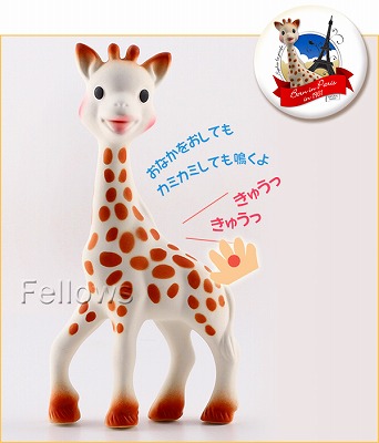 五感を刺激して赤ちゃんを虜にするフランス生まれのキリンのソフィーこちらのキリンのソフィーという名のお人形。実は、フランスでファーストトイとしてとっても有名なおもちゃなんだそうです。このキリンのソフィー、とにかく赤ちゃんの五感に働きかけ、興味をぐいぐいひくので、日本の赤ちゃんもお気に入りになること間違いなしです。ショップ:出産祝いのベビー服専門店 FELLOWSオススメポイント・視覚、嗅覚、味覚、触角、聴覚の5感を刺激し、赤ちゃんの興味をグイグイ引きつけます。視覚→茶色と白のコントラストは、まだよく見えない赤ちゃんの目にも認識できます。嗅覚→天然ゴムの木のいい香りです。味覚→天然ゴムの噛み心地は赤ちゃんにとって最高です。ソフィーの耳・足・体など、部位によって噛みごたえが違うのもおもしろいです。触角→お母さんの肌のようなやわらかい触り心地で赤ちゃんを安心させます。聴覚→触るとキュキュっとかわいい音が鳴ります。・100%天然ゴム製で、なおかつ、食料塗料を使用しているため、赤ちゃんがお口の中にいれても全く問題ありません。赤ちゃんのおもちゃは、安全・安心なものが一番ですよね。・海外セレブも愛用している、世界中で認められ愛されているベビー玩具です。・子ども用品の製造基準では最も厳しいとされているCEマークを取得しています。・出産祝いのプレゼントにオススメです。ギフト・のし対応あり(無料)メッセージカードあり(無料)あす楽対応ショップ:出産祝いのベビー服専門店 FELLOWS