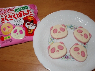 「さくら さくさくぱんだ」のお菓子を娘が今日食べようとして袋からだしたら、ぱんだの目がのものや、たれ目のものなど、でてきて、とってもかわいかったですこんなぱんだの顔も入っているんだと思いました。