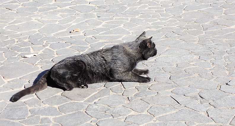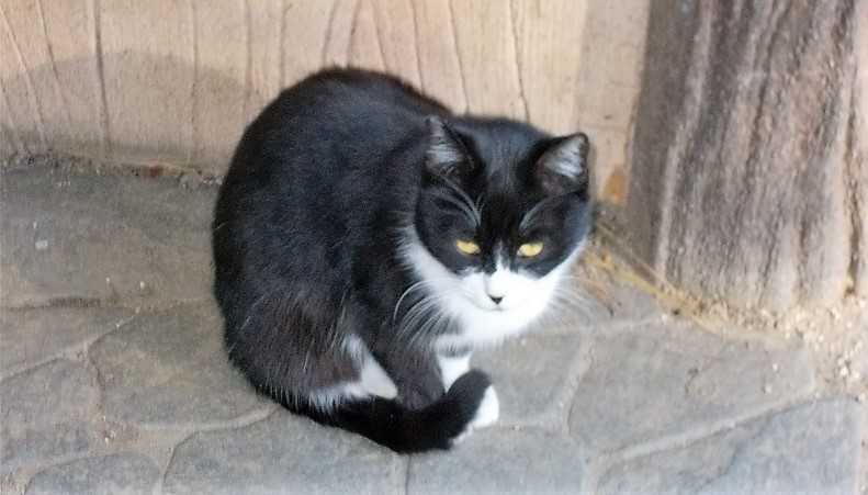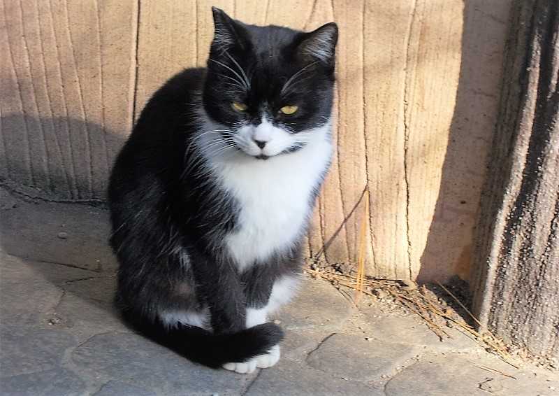 ​​東屋の陰で 犬の散歩が通り過ぎるのを待っていた猫。