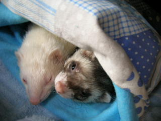 寒いですね~ここ数日、特に・・・!!明日は県内では桜の開花宣言が出るとかなんとかニュースで言ってたような気がします。こんなに寒くて桜なんて咲くんかいな??考えてみると、お花見シーズンってけっこう寒いんですよね。夜桜見学なんてしようもんなら、もう寒くてブルブルでもでもやっぱり桜が咲くのは楽しみですね!!桜が咲くようになったら、小太郎達を連れてお散歩に行こうと思っています近くにお花見スポットの公園もあるしでも、お散歩に連れて行くと往々にして公園を散策中のおじさん&おばさんに囲まれます・・・。「それナニ?!」「ナニ食べるの?」「噛むの?」最初の頃は快く答えてあげれたのですがだんだん面倒になってくるんですよね。フェレットって認知度が低いのね 今日は写真を撮らなかったので去年の夏頃の写真を載せちゃいました。おっさん紋ちゃんの第2弾。カモノハシじゃないですよこうやって並んでみると大きさの違いが分かりますね~。ようやく仲良く一緒に寝てくれるようになった頃です。お腹のおっきかった紋は丸くなって寝ることができずいっつもこんなポーズで寝ておりましたところで小太郎君。あなたのお鼻の位置が紋の微妙なトコにあるんだけどクサくないですか~??