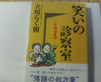 平成22年1月23日(土)12:20噺家(はなしか)に「立川らく朝」という人がいる。あの有名な立川談志に認められたれっきとした立川一門であり、また、医学博士で「表参道福澤クリニック」の院長先生でもある。いわば、内科のお医者さんがプロの落語家になったのである。この方は大変優れた方で、「健康噺(はなし)」や「ヘルシー噺(トーク)」はたまた「健康一人芝居」などの新ジャンルを開拓した人でもある。今日ご紹介する本は「立川らく朝健康噺」から「笑いの診察室」という本である。第1話 認知症への処方箋第2話 タバコ好きへの処方箋第3話 糖尿病への処方箋第4話 メタボリックシンドロームへの処方箋第5話 高血圧症への処方箋あとがき 「アンチねばならぬ健康法」と、いった内容である。なんだか、団塊おじさん(よっしーせお)は、すべて該当しそうで、読むのが怖い感じ。読んでみると大変おもしろくて、読んでいても一人でクスクス笑えてくる。おおまかに言うと、クリニックで診察をし、その処方箋に「落語のCD」を渡すというもの。確かに、介護センターなどに落語家を呼べば、年寄りがみんな元気になるやがん患者さんを旅行に連れて行き、そこで大いに笑って元気になった等の話しを聞いたこともある。「笑うかどには福きたる」ということであろうか。また、あとがきが素晴らしい。「アンチねばならぬ健康法」である。公園の周りを脇目もふらずにジョギングしているお父さん達を見ると、健康というニンジンを目の前にぶら下げられているかのようにも見えてくる。尤も、本人が心からジョギングを楽しんでいて、カロリーを摂り過ぎない食生活がもう人生の一部になっていて、その結果が若々しく活力を失わない長生きであったりすれば、これはもう拍手喝采ものであり、素晴らしいの一言である。「やまいは気から」の通り、笑って過ごせば病気の方からどこかへ飛んでいってくれるような気もしますね。話は変わりますが、おかげさまにて「人気ブログランキング」が第59位になっていました。今年はじめに目標をたてましたが、早くも達成いたしました。これはひとえに皆様方の「ポチッ」のお陰です。また今後とも「ポチッ」という音が遠いむこうから聞こえてくることを想像しながら、ブログを続けていきたいと思う今日このごろです。引き続きご声援いただきたく、すみから・・すみまで・・お引き立て賜りますよう伏しておん願い・・申し上げます・・・ トザイトーザイ 第59位 団塊おじさん(よっしーせお)の今日の一言 過去30年間、気になる言葉を記録しました最新記事:2010/01/21 10:36 [人間、死ぬまで成長す。] [吉永小百合の「寒い朝」] 380 270 1220 ↓今後ともこのブログを続けた方が良いとおっしゃって頂ける方は、下記をクリックして下さいね。