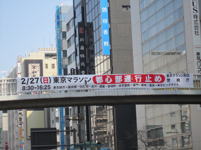 平成23年2月24日(木) 10:56 仏滅↑ 今度の日曜日、いよいよ東京マラソンですね。 陸橋の横にはこんな垂れ幕がありましたよ。(江戸通り日本橋本町にて)毎年、この時期に、今年で3年目ですか。希望者殺到で凄い人気のようです。逆に昔からこの時期で有名だった青梅マラソンの方は下火だとか・・へえー! 東京マラソン財団というのもあるんだー。石原都知事が来月の都知事選に出馬するかどうか?まだ決まっていないようです。ワタミの渡辺氏は出馬を決めた。東国原知事や蓮舫氏は出馬するのか。神奈川県知事は? しばらくは目が離せそうもありません。石原知事の政策でこの東京マラソンは成功したものといって良いのでしょう。オリンピック誘致は失敗で、多額のお金が無駄になっってしまった。パンダはどうか? まだ成功かどうかは分からないが、人気はかなりある。中国に払う年間借用料が8千万円×10年だそうだ。いったい誰が負担するのか?というと、これを東京都が払うという。つまり我々都民の税金。 他にえさ代が年間1千万円×10年とか。動物園の入場料だけではとても賄える金額ではありません。近隣のスカイツリーやら浅草寺とタイアップして、地域を盛り上げる狙いがあるという。はたして、これ以上の経済効果はあるのでしょうか。スカイツリーから、浅草、上野までパンダ模様の無料バスも走らせると言う。成功してくれるといいのですが、もうこれ以上の失敗は許されませんよ。↑ 日本橋本町陸橋の上から、建設中のスカイツリーを望む一方、世界に眼を向けると、ニュージーランドの大地震。日本からの留学生やら語学研修の生徒達もぞくぞくガレキの下から発見されている。本当に悲しい出来事です。あの阪神大地震なみというから、すごい。足を切断せざるを得ないという人もいる。それでも助かるならと必至の救出作戦。一人でも多くの命が救えるよう、ただただ祈るばかりです。ニュージーランドも日本と並ぶ地震大国だそうです。まあ、自然相手ですから、人間の方ではどうこうすることもできない。せいぜい地震予知能力をアップするとか、強固な建物とか、救助犬の訓練とかくらいのもの。それに比べ人間同士の争いは何とかなるハズ。中東の問題しかり。世界中で異変が起こっている。日本でも最近の政治は異常である。国会質問における野党女性議員の、総理に対たる発言などあまりにもひどい。誹謗中傷は聞きたくもない。菅内閣は小沢問題から大変な状況になってきた。閣内からも松木農水政務官が辞任したとか。もう、世界も日本もどうなってしまうのでしょう。異常気象で野菜が値上がりしたと思ったら、今度は石油も大幅値上がりの予感。TPPも反対派続出、消費税と年金問題も誰も納得がいかない。やはり、国民が納得できるよう十分議論を尽くさないで、中傷ばかりやって選挙にはいっても、選びようがない。過去のことはもうどうでもいい。これから将来どうするか。どうゆう方向に進みたいのかの議論を戦わせるべきであろう。このままでは不安だらけで、どの政党も選びたくないということになるのではないでしょうか・・・昨夜はいっぱい飲みながら、そんなことを考えておりました。お酒というと、別名「般若湯(はんにゃとう)」ともいう。この般若湯、高野山のお坊さんが名づけたという。仏門の世界では、お酒は当然ご法度。ところが、高野山は寒くて、お坊さんといえどもお酒を飲まなければやってられない。そこで、これはお酒じゃあない。般若湯というお湯ですよといったわけだ。般若とは、もともと仏語用語で、悟りを得る知恵とか真理を把握する知恵とかといった意味のことばです。高野山の坊さん達、うまく考えたものだ。戒律の厳しい仏教界で、これをクリアーするために、もう一つ考えた。それは、社会を救う為の真実の知恵という名の般若湯を飲むために、いっぱい飲むごとに社会が良くなる為のアイディアを一つづつ出し合おうというものである。そう考えて、厳しい戒律を乗り越え、はれて寒い夜に晩酌を楽しんだらしい。いかにも、恐れ入りやの鬼子母神。納得がいくような、いかないような・・修行を積んだお坊さんといえども、なかなか煩悩には勝てないものなのですね。ましてや、庶民の私どもが、「晩酌とたばこ」位は大目に見て世ねえぇ・・・あはは。さあ、今日の音楽です。懐かしい歌を聞くと、心にしみるものがでてきて、心がうきうきしてくる。心にしみる物質は脳からでてくる。その名はドータミン・・・わたくし、この歌を聞くと、行ったことのない土地ですが、何故かドータミンがでてくるのです。そう感じられたことはありませんか? 石川さゆり - 津軽海峡・冬景色これも、「阿久 悠」作詞なんですね。 すごーい。↓ 今日も最後まで読んで頂き、ありがとうございました。 当ブログは、「日記(その他)ランキング」で、1700人中、只今40位前後です。 今後ともこのブログを続けたほうが良いと、仰っていただける方