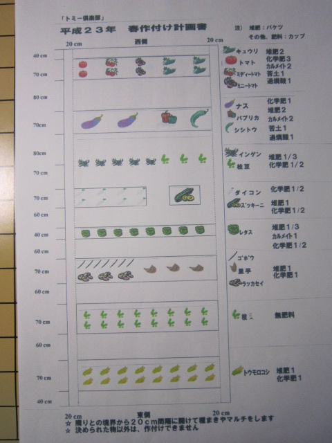 平成23年2月22日(火) 11:25 友引 ニコニコの日今日は2月22日、ニコニコの日ですね。今日一日ニコニコしてましょうか・・しかしながら、中東ではニコニコしてませんね。怒ってばかりです。民主化を求めるデモで、国民に発砲する政府なんて、何を怒っているのでしょう。暴力で人を押さえ込むなんて、もってのほかです。日本でも新燃岳も怒っています。せめて今日一日だけでも、ニコニコして欲しいです。早朝は寒かったですが、陽射しが出てきたら春めいてきました。自然界は春の準備完了の様子です。人間も自然に生かされているのですから、人間同士の争そいは馬鹿げてますね。後ろから読んでも「よのなかばかなのよ」「たけやぶやけた」話しは変わるが、半年前の22年8が5日の当ブログにも書きましたが、「もしドラ」(「もし高校野球の女子マネージャーがドラッカーの『マネジメント』を読んだら」)と言う本、その後随分ヒットしているようですね。私は図書館でこの本を予約しておきました。その時の待ち行列が300番台でした。今日の順番は37位となっています。半年で300人進んだこととなります。もうすぐです。楽しみ待っています。それがなんと、この本がテレビでドラマ化されることになりました。それもNHKです。第1回が3月14日夜の10時頃の予定です。テレビで見れるのも楽しみだなあ。さあ、図書館の本が早いか? どうでしょうか・・むかし、ドラッカー教授が日本に来た時、東京のサンケイホールに講演会を聞きに行きました。その時の面白かった印象に残る話では、ドラッカー氏が東京に来て一番ビックリしたのは、日本ではホームレスの人が日経新聞を読んでいたということでしたと。日本人のレベルの高さに驚いたと言う話だけが、今でも印象に残っています。確かに日本は江戸時代には国民の7割が読み書きできたという。その頃の欧米人はせいぜい3割程度というから驚きです。なぜか、私はその要因は「寺子屋」の存在だと思う。日本中、すぐ近くに寺子屋があり、子供たちが皆集まって勉強している。大人たちはあの難しい数学の遊びや、高い文化、芸術、技術。庶民が皆楽しんでより高度な問題にチャレンジしていた。お風呂屋で解答を競い合っている庶民の姿が浮かんでくる。大工の棟梁が若い衆を仕込んだりして・・そうして、みんなで知恵比べをして、切磋琢磨していたのだ。それが最近は学力にしても、経済力にしても、アジア系各国に圧倒されてしまっている。政治のゴタゴタはもうどうでもいい。もっと国民が安心して、楽しめる国にならなくてはまずい。子供の保育園も重要だが、その前に若者が結婚できる環境を作らなくてはなるまい。今の少子高齢化が進み、もうしばらくすると、おばあちゃんの知恵袋も引継ぎできなってしまいます。中東のデモも国民のレベルが上がってきたことの一証左ではなかろうか。まあ、ニコニコの日に因んで、こんなことを考える団塊おじさん(よっしーせお)でした。今日のタイトルは、体験農園トミー倶楽部におけるこの春の作付け計画です。一昨日の日曜日、近くのJAで、農園の契約更新日でありました。今年も数万円の契約で、トミー農園を続けたいと思い、契約いたしました。これで、5年目に突入です。早速、春の計画書を見てみましょう。今年は新しいものとしては、ミニごぼうと落花生でしょうか。ふむふむ、楽しみだぞ。3月12日から、いよいよスタートです。先ずはじゃがいもから、レタス、大根、里芋、ズッキーニと忙しくなりそうです。さあ、今日の音楽です。 舟木一夫 花咲く乙女たち まとめ書き↓ 今日も最後まで読んで頂き、ありがとうございました。 当ブログは、「日記(その他)ランキング」で、1700人中、只今40位前後です。 今後ともこのブログを続けたほうが良いと、仰っていただける方は、 お帰りに、下記ボタンを1日1度、ポチっと応援していただけると励みになります。 (1日1回のシジミ汁の歌が聞こえてきそう・・・なーんてネ?) ☆ いつも・・いつも、感謝・感謝の気持ちで生きてきたいものですネ! *** 明日枯れる花にも水やる心 ***じゃあ又ね!