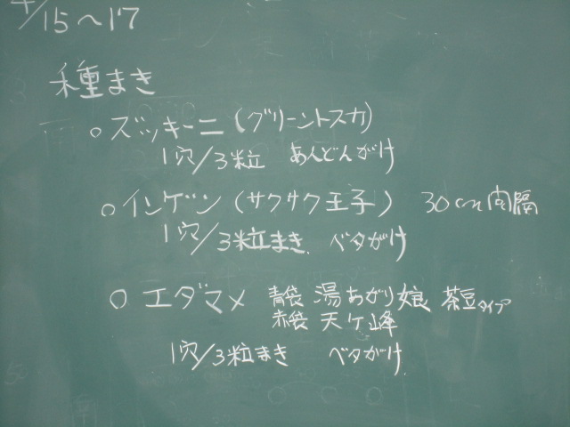 平成23年4月19日(火) 21:50 養育の日どうも最近、ニュースを見ているとイヤな気分になってしまう。福島から避難した小学生が、福島から来たと言ったら子供達が皆いなくなってしまった。とか、東京で娘さんの結婚式があるので福島から車で来たら、福島ナンバーの車はガソリンスタンドで給油してもらえない。そんな話を聞いたので、已む無く電車で来たとか。こんな話、聞いたらいやですね。一部の人だけだと思うけど、人間の風評被害はちょっとねえ。さて、今日は野菜の植え付けの話です。先ずはズッキーニの種まきです。約1ヶ月前30センチ掘って、堆肥と化学肥で準備していた畑に種まきです。グリーントスカというズッキーニの種を1穴/3粒まきです。ズッキーニは大きくなるので、十分余裕を持って広い場所を確保して有ります。そうして、あんどん掛けです。あんどん掛けといっても簡単なもので、ビニール袋の底を切って、四隅に支柱を立てます。このときビニール袋のすそを一緒に土に差し込むことにより風で煽られるのを防ぎます。更に、ビニール袋の上の持手の部分を結び、雨が入らないようにしておきます。あんどん仕立ての後は↓これは鳥除けと地温アップのためです。そのほか、インゲン(サクサク王子)を植え付け、枝豆(湯あがりむすめと天が峰)の種まきをしました。↓ さらに、2週間後の植え絵付けのための畑の準備です。ナス、パブリカ、シシトウの列は40センチの深さに掘って、肥料を入れ、トマト、キュウリの列は30センチの深さにほります。両方とも黒マルチ掛けして、地温を上げます。かなりの重労働でしたよ。2週間後にこれらを植えつけたら、春の植え付けはすべて完了することとなります。その後の野菜の状況です。↓レタスの列↓ミニ大根、葉大根の列です。以上です。↓ 今日も最後まで読んで頂き、ありがとうございました。 当ブログは、「日記(その他)ランキング」で、1700人中、只今50位前後です。 今後ともこのブログを続けたほうが良いと、仰っていただける方は、 お帰りに、下記ボタンを1日1度、ポチっと応援していただけると励みになります。 (1日1回のシジミ汁の歌が聞こえてきそう・・・なーんてネ?) ☆ いつも・・いつも、感謝・感謝の気持ちで生きてきたいものですネ! *** 明日枯れる花にも水やる心 ***じゃあ又ね!