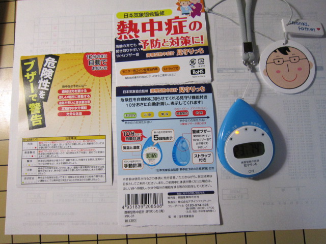 平成23年6月20日(月) 13:57 大安昨日は「父の日」でしたね。お父さん方は、子供達から日頃の感謝のプレゼントが届いたことでしょう。父の日は母の日に比べて、盛り上がりが少ないようですね。私は昨日の父の日には、自分へのプレゼントのつもりでゴルフに行ってきました。やはりそういった下心があると、いいスコアもでませんね。あはは。ゴルフが終わって、家に帰って自分の机の上を見るとなにやらプレゼントらしきものが・・・嫁にいった末の娘が父の日プレゼントを届けてくれていました。メッセージはいつも美味しい野菜をサンキューだって。早速明けてみると、「見守りっち」というものでした。写真のとおりです。まだこんなものがいる歳ではないぞ!と、思いつつ説明書きを読んでみると、あったら便利かなあって思いました。これは、日本気象協会の監修で製作されたとか。温度計と湿度計がついており、気象協会独自の算出法で、熱中症の危険性を5段階で評価し、危険ラインが近づいたら10分間隔で自動的にブザーで知らせてくれるという優れものです。第1段階 ほぼ安全第2段階 注意第3段階 警戒第4段階 厳重警戒第5段階 危険の5段階で、第4第5段階になれば即対応が必要ということです。ちなみに、今の私の部屋は、ボタンを押してみると26℃ 66% で、第2段階の注意のランプが点灯しています。ことしの夏は、暑いうえに節電。熱中症は、年寄りのみならず、若い人も多いようですね。ピピピとブザーがなったら、涼しい場所に移動し、水分補給と塩分補給が必要ですね。ちょっといいプレゼントでした。娘よっしー、どうもありがとう。さあ、今日の音楽は、トロイメライです。つい口笛を吹きたくなるような曲ですね。 シューマン トロイメライ Schumann Traumerei 牧瀬由紀子↓ 今日も最後まで読んで頂き、ありがとうございました。 当ブログは、「日記(その他)ランキング」で、1700人中、只今50位前後です。 今後ともこのブログを続けたほうが良いと、仰っていただける方は、 お帰りに、下記ボタンを1日1度、ポチっと応援していただけると励みになります。 (1日1回のシジミ汁の歌が聞こえてきそう・・・なーんてネ?) ☆ いつも・・いつも、感謝・感謝の気持ちで生きてきたいものですネ! *** 明日枯れる花にも水やる心 ***じゃあ又ね!