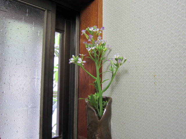 平成23年6月14日(火) 12:21 大安↑ ブルーのセージです。正式名は「サルビア・ガラニティカ」というのでしょうか? 自信がありませんが。 葉がいい香り。ゴキブリが逃げていくとか。↑ あじさいをいけてみました。右下の長い葉は紫ランです。さて、今日の一言は「和ガラシ」について考えてみる事と致しました。といいますか、この話しは何かの本で読んだものです。テーマ:「和ガラシ」は、お湯で溶いた方が辛いといいますが、なぜですか?解答の前に・・・↑ からし菜、あぶら菜の種です。 昨年百円ショップで買ったものです。 2袋で百均ですから1つ50均ですね。この種をスポンジ生地に植え、液肥と僅かな土だけで育てています。↑ 家庭で出来る簡単水耕栽培でここまで成長してきました。 材料はほとんど百均で揃います。本題に戻ります。「和がらし」は、この「からし菜」の種を粉末にしたものです。 からし菜はあぶら菜科です。 その辛みのもとは「アリルカラシ油」という刺激物質です。 普通アリルカラシ油は、ブドウ糖と結びついていて辛くもなんともないのですが、 水分があると酵素の働きで分離して辛くなるのです。 酵素がよく作用する温度は40度Cといわれているので、お湯の方が水より 早く辛くなるというわけです。従って、ピリ辛の好きな人には、「お湯で溶く」がおすすめです。このからし菜もゆでるとピリ辛で美味しいですよ。さて、今日の音楽は リンゴ村から 三橋美智也 1976年古い歌ですが、懐かしいですナ。そういえば、昨日の「鶴瓶の家族に乾杯」で、信州のりんご農家の方がりんごの枝は下向きに誘導すると言ってました。枝を下に向けないとりんごの実がならないのだってサ。↓ 今日も最後まで読んで頂き、ありがとうございました。 当ブログは、「日記(その他)ランキング」で、1700人中、只今50位前後です。 今後ともこのブログを続けたほうが良いと、仰っていただける方は、 お帰りに、下記ボタンを1日1度、ポチっと応援していただけると励みになります。 (1日1回のシジミ汁の歌が聞こえてきそう・・・なーんてネ?) ☆ いつも・・いつも、感謝・感謝の気持ちで生きてきたいものですネ! *** 明日枯れる花にも水やる心 ***じゃあ又ね!