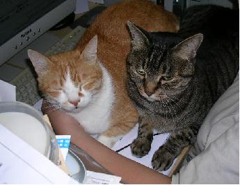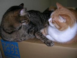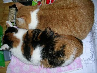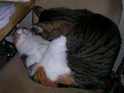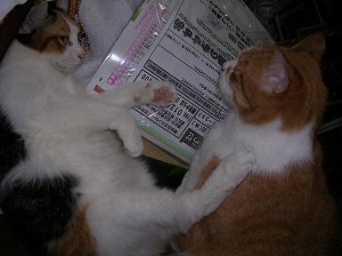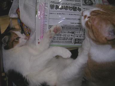 ニャゴがミュウを襲っています・・・ミュウが反撃を・・・結局、落ち着いちゃいました・・・どうでもイイけど、そこはおとうちゃんの椅子なんですけどね・・・(-_-;)