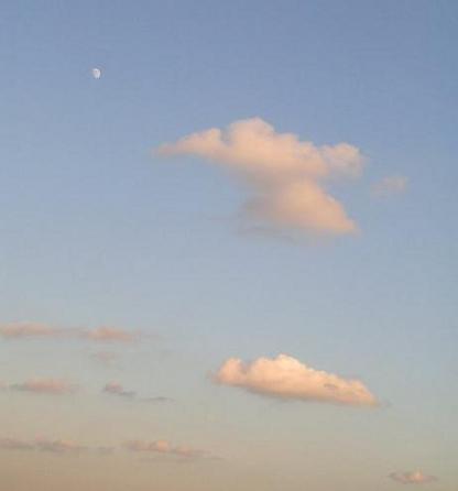 夕日じゃないけろ(けど)・・・夕方にお月さん(左上)がポケっと出ています。ねこママ撮影