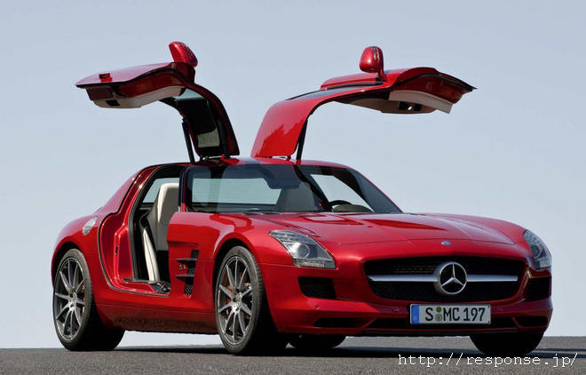 どうやら新しいベンツがでるようです。その名も【SLS AMG】!!以下 転載↓ダイムラーは10日、新型車メルセデスベンツ『SLS AMG』を、15日に開幕するフランクフルトモーターショーで初公開すると発表した。ダイムラーが新たに公表した写真から、新型のディティールを紹介する。新型SLS AMGは、メルセデスベンツの名車中の名車といわれる1954年発表の『300SL』を、最新技術で甦らせた同社の新フラッグシップスポーツカー。メルセデスベンツの高性能車開発部門のAMGが、デザインからメカニズムまで、すべてを手がけた最初のモデルで、ロングノーズ&ショートデッキの古典的スポーツカーフォルムには、300SLの特徴的なガルウイングドアが継承されている。エンジンは、『63AMG』シリーズの「M156型」6208cc・V8をベースに、約120か所に渡る専用チューンを受けた「M159型」。ドライサンプオイル潤滑システム、強化クランクシャフトベアリング、鍛造ピストン、新設計インテークなどを採用し、最大出力571ps/6800rpm、最大トルク66.3kgm/4750rpmを絞り出す。欧州複合モード燃費は7.57km/リットルで、ユーロ5やLEV2、ULEV基準を満たす排出ガスなど、環境性能もスーパーカーとしては高水準だ。エンジンは低重心化のため、フロントアクスル後方の低い位置、フロントミッドシップにマウント。トランスミッションはリアアクスルに配置するトランスアクスルレイアウトとした。トランスミッションは、新開発のデュアルクラッチ7速2ペダルMT、「AMGスピードシフトDCT-7」。オールアルミスペースフレーム構造により、車重が1620kgに抑えられた結果、SLS AMGは0 - 100km/h加速3.8秒、最高速317km/hという世界最高峰の性能をマークする。今回公表された写真は、アグレッシブな赤いボディカラー。フルレザー内装にはブラック、クラシックレッド、ホワイト、サンドなど、豊富なバリエーションが用意される。新型SLS AMGは2010年春、欧州で販売開始。ドイツでの価格は、17万7310ユーロ(約2355万円)からとアナウンスされている。なんか自分はフロントがパッと見R35かF430に見えます。