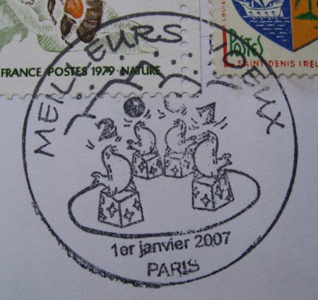 郵便関係をご趣味としているいわゆる郵趣のなかでも風景印を集めるタイプのご趣味をお持ちの方。はい。私。小型印はあまり興味はなくもっぱら風景印。そのきっかけというのは?フランスからの手紙。毎回、小型印が押されてくるので手っ取り早くお返事を返すのに私もたびたび風景印を集めるように。そこから、送るために集めているのか、集めるために押しに行くのか。っと境界線がはっきりとしなくなってきました。さて、今回は私が集めた風景印ではなく、フランスからやってきた小型印。小型印、風景印の違い?あ~。今日は遅いからその辺の説明ははぶきます。あしからず。(あ。。。おやじぎゃぐ?)