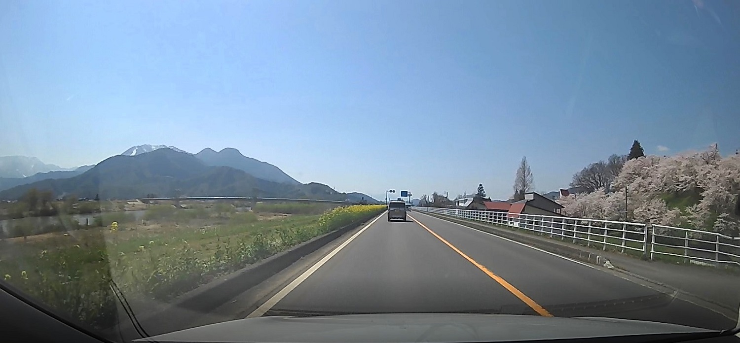 飯山の千曲川沿いの国道は菜の花と桜に彩られて春を満喫できる。