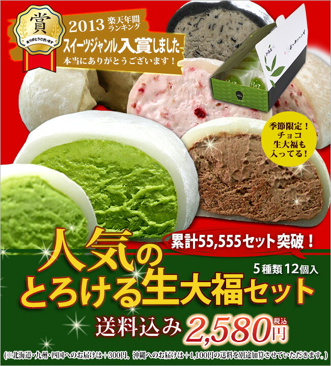 抹茶の香り、苺の風味、モカのほろ苦さ・・・♪お好きな味を好きな時に楽しめる5種類の味の詰合せ!おまけ付き!楽天1位【送料込み!人気のとろける生大福セット】価格 2,580円 (税込) 送料込 取り扱いショップ:お茶とどら焼の胡蝶庵
