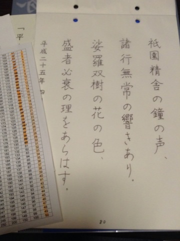 今回は、臨書をイメージしつつなぞり書きをしましたよ。どういうことかと言いますと、トレーシングペーパーの下にお手本を置く。これは通常のなぞり書きと同じです。それから書き込みが済んだ「平家物語」のページを横に置いて、臨書気分で書くのです。(書き込み部とお手本部がある『集中力を育てるペン習字トレーニング』だからできる事だと思いました。)トレーシングペーパーの下にあるのが文字ではなくて例えば図形だとしても同じようになぞっていただろうと思えるガチガチのなぞり書きから抜け出すことができた気がします。