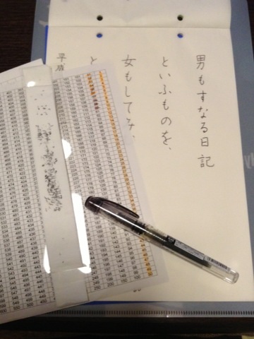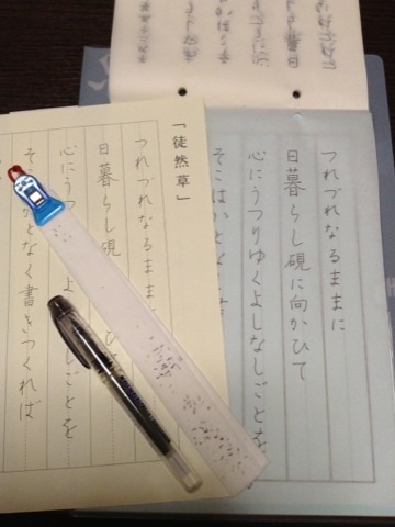 1項目目 「竹取物語」6日間で20枚書きました。眠っていた「プラチナ万年筆 プラピー」も順調で、インク交換も経験しました。ちょっとした課題は、インクの乾きですね。縦書き文字に右利きですから、書いたインクの跡に右手を置くので、テッシュペーパーでおさえてから次を書いています。調べたところ、「吸い取り紙」とか「ブロッター」とかというものが有るんですね。見たことはあるのですが「ブロッター」という名称は知りませんでした。下敷きは、厚紙を使っています。臨書の時は、その厚紙下敷きの上に罫線を引いた紙を置いています。明日からは「徒然草」です。