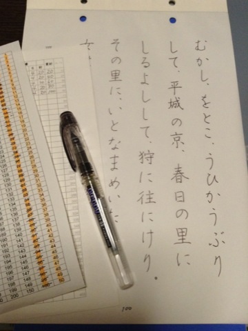 伊勢物語完了。伊勢物語が完了して、ちょうど100枚書き終わりました。あと残り500枚。なぞり書きの前半、臨書の後半。臨書の最初の方はよいのですが、書くにつれて思うように書けなくなってしまいます。「ひ」とか「し」とか。なんとなくの曲線になってしまっています。なぞり書きの段階でイメージを定着させる練習をし、臨書の段階で再現できるようにする、というのが方向性ですね。「頭でわかっていてもできない」ので、丁寧に観て、書くのみです。がんばります。