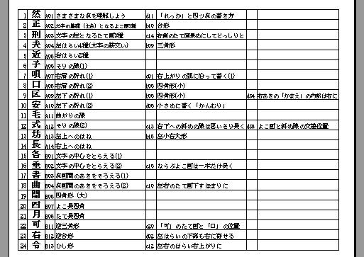 日ペンの楷書の項目もあと7日分。私のゆっくりペースだと約2週間分になりました。日ペンでの楷書の課題が終わっても、私の中の楷書の練習に終わりはありません、多分。そこでこんなリストを作ってみました。日ペンの、「右はらい」とか「四角形」とかの楷書の項目って数えてみたら60個以上あるんですよ。その各項目に対して複数ある漢字から代表を決めて、その代表漢字で各項目を復習したらどうかなって思いました。でも、例えば「区」は3項目にまたがっているので、漢字2個分節約できます。それで漢字48個に絞りこみました。この代表漢字48個で、各項目を忘れないようにしようと目論んでいます。にほんブログ村