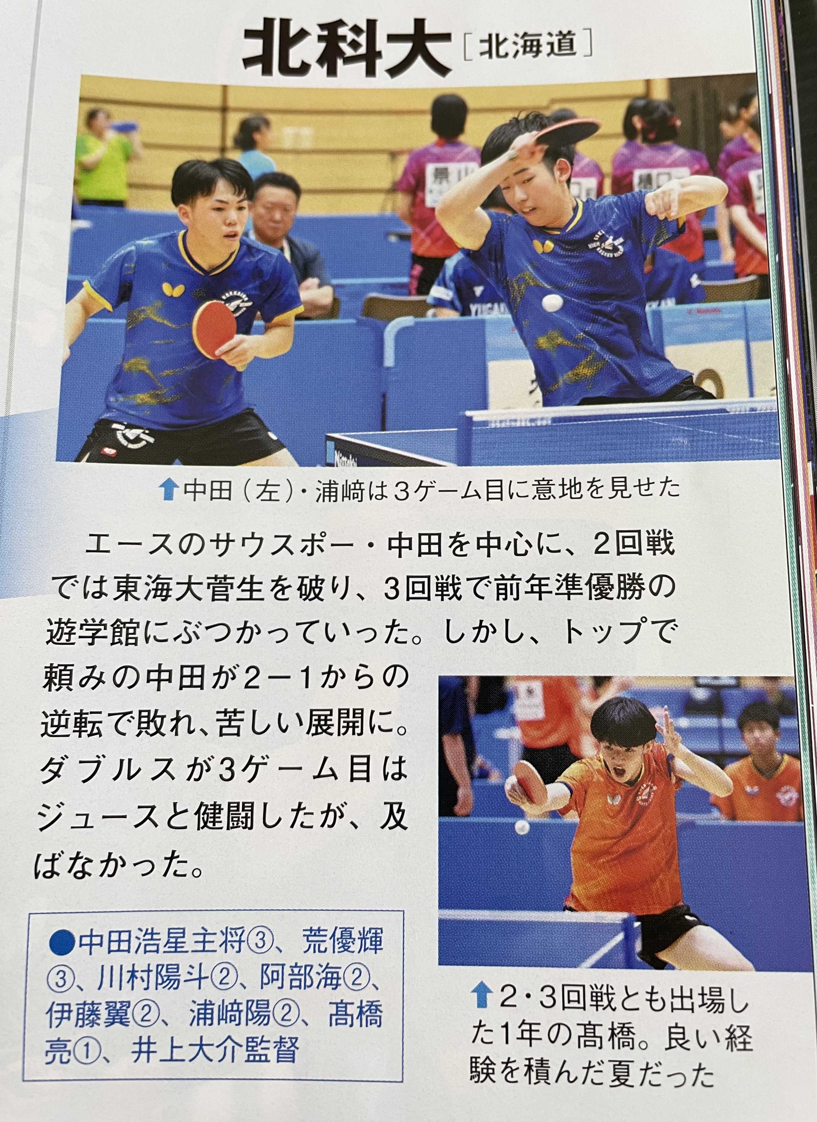 卓球王国の写真です。北海道の高校で掲載されているのは、北科大だけでしたので転載させていただきました。すでに選抜を見据え、北海道大会に出場した選手ではなく1年生を起用しました。すでに選抜が始まっているわけですか。北科大はエースが抜けてしまいますから、新エースはもちろん、新レギュラーを鍛えるための起用ですね。12月末にはインターハイ北海道大会で決勝を戦った2校が、選抜でも優勝を争うものと予想されます。現段階ではツインエースのインターハイ準優勝校が有利だと思いますし、準備もしっかりしていると思いますが、大会まであと4ヶ月ありますのでまだまだ予断を許さないところですね。さて、これから9月には国体、10月には北海道ジュニアと続きます。各選手、またチームともにレベルアップに励んでいることだと思います。皆さんの練習での頑張り、また試合でのご健闘をお祈りいたしております。