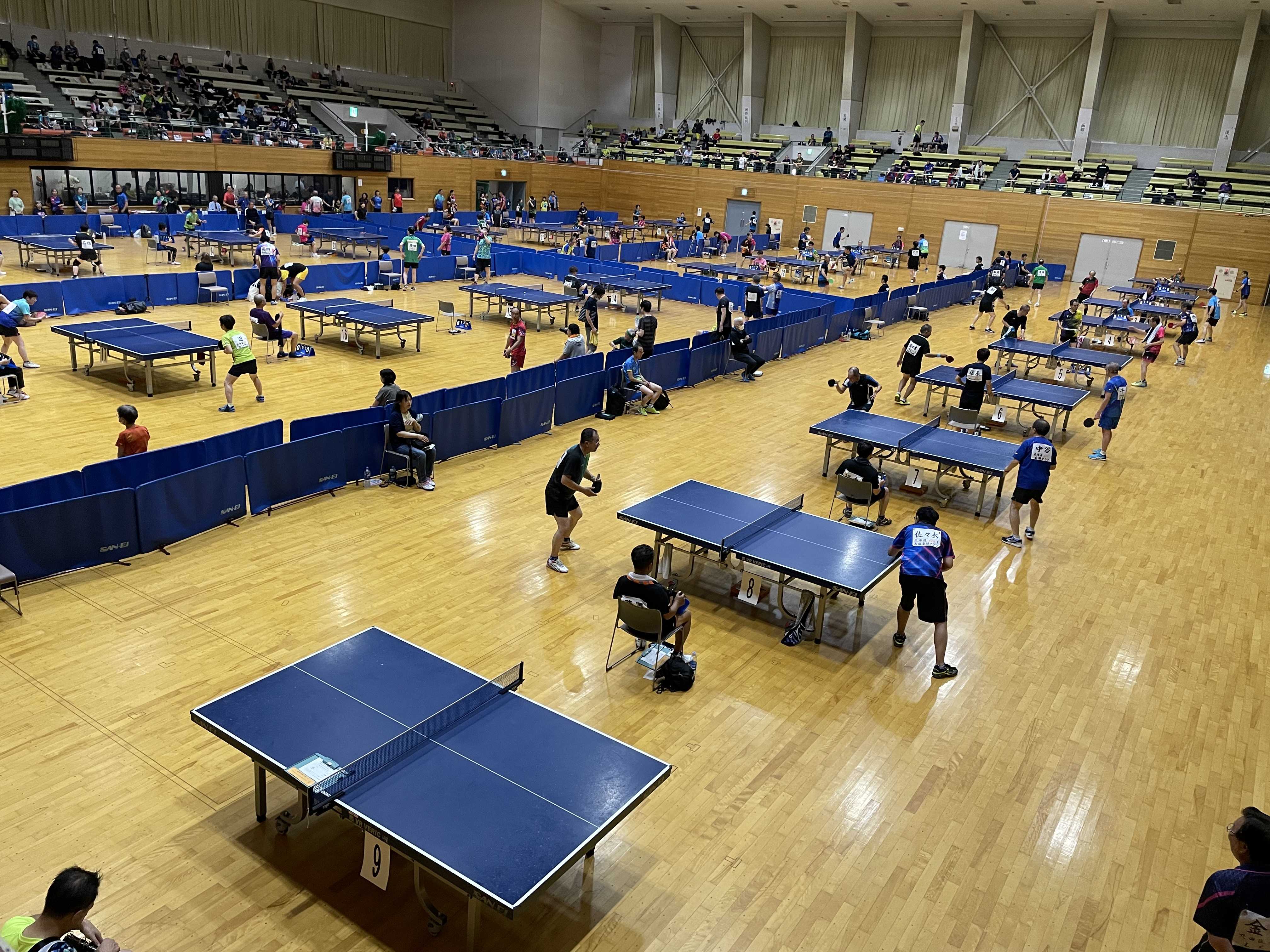 往年の名選手たちが熱戦を繰り広げておりました。久しぶりに見た道工OB「左山田選手」も相変わらずの強さでした。さすがは50歳以上の部です。ペンホルダーがシェークハンドを凌駕しておりました。笑しかも「片面」です。焼きそばの固麺ではございませんよ笑裏面なしの「ペン」です。日高ジュニア監督の同級生「M藤選手」も登場です。もちろんペンドラですが「俺は裏面貼ってるよ、でも使わないけど笑」ただラケットを重くしているだけです。すごいのは「今日は夕方6時から日高ジュニアの練習がある」とのことです。シェークハンドの選手も、普通にバックサーブを使います。シェークハンドの選手でバックハンドを振る選手は皆無。バックはブロックとつなぎに徹していおりますし、バックアンチなんて選手もおりました。では、茸ちゃん特報をとりあえず1勝したササキインテリアの「茸ちゃん」にアドバイスをする、道工の後輩、近大OBの「奈良の修選手」です。道工が全国3位のときの1年生が「茸ちゃん」です。(もちろん試合には出ておりません)今日は会場に、その時のメンバーで道工から近大で活躍したY山さんが、仕事で来ておりました。まるで小野誠二さんのようなフォアドライブボールをよく見ていますねボールを見ろと、名将有賀先生に怒られていたのでしょう。見すぎているような笑バックハンドはないと同じですね(苦笑)しばらく会場で試合を見ていたのですが敗者審判をしている「茸ちゃん」を見つけたので帰ってきました。笑夕方まで熱戦が続くものと思います。みなさん怪我をすることなく、頑張ってほしいと思っています。