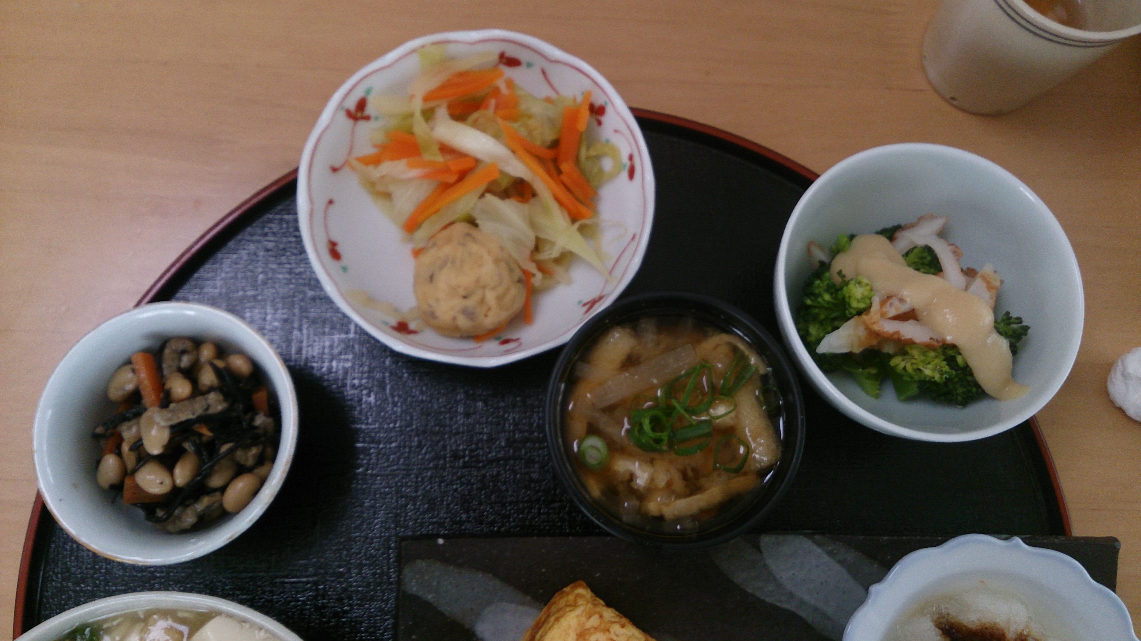 ひじき大豆   キャベツとひろうすの煮物 味噌汁  ブロッコリーの酢味噌和え