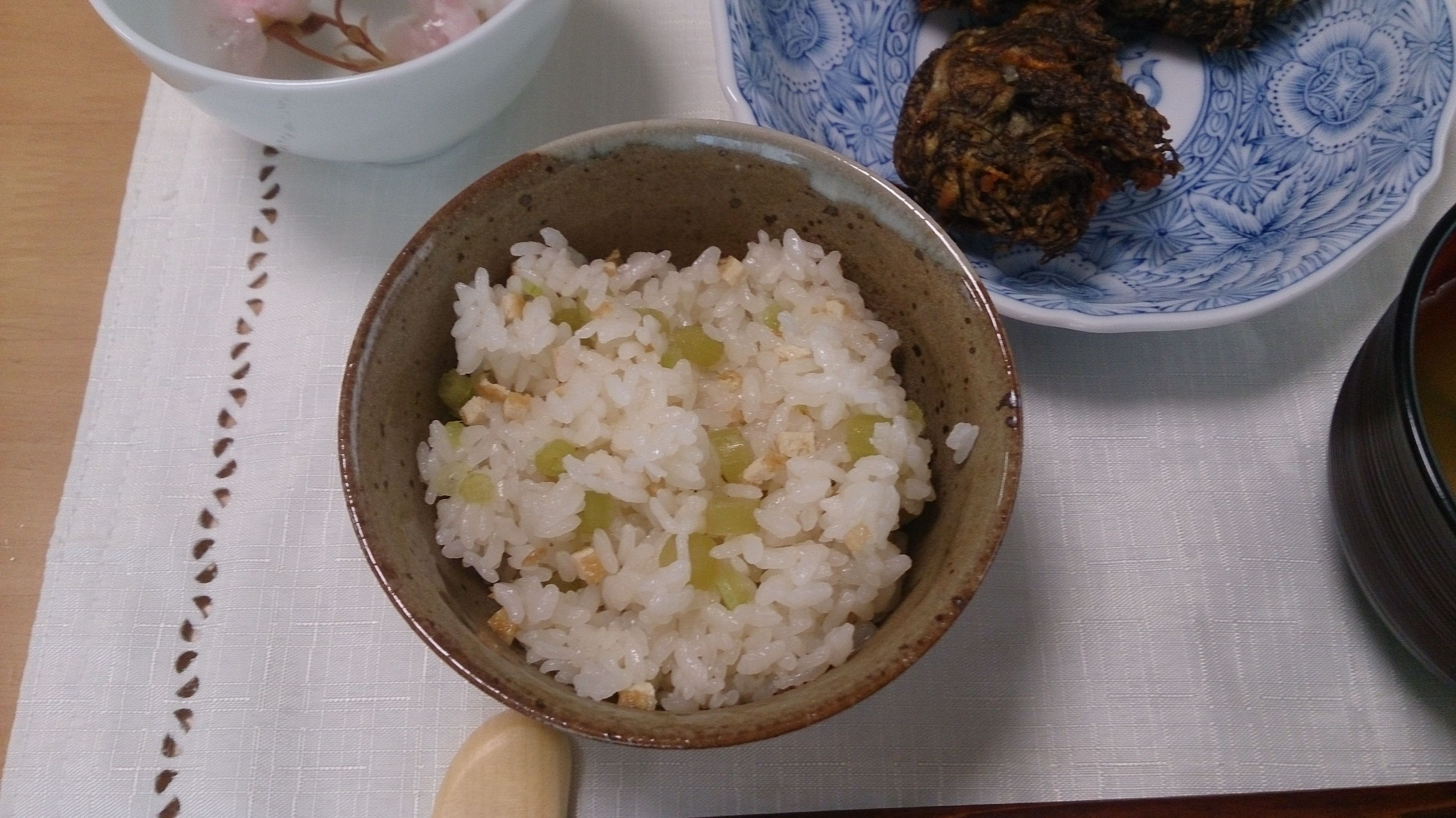 フキの炊き込みご飯 水雲の天ぷら お豆腐のお味噌汁