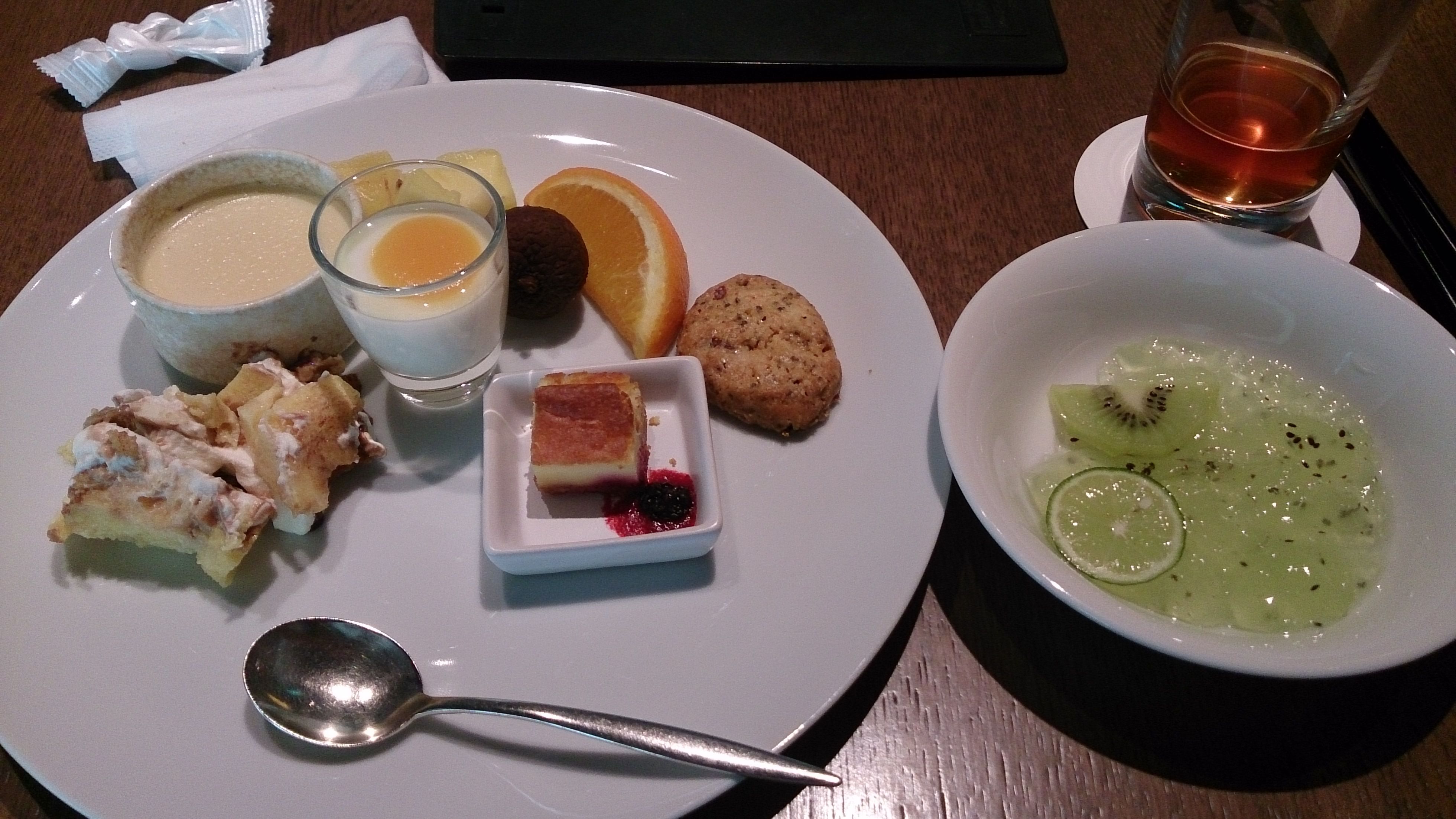 ブッフェで取った前菜たち。左にちらっと見えるのはカレーです。