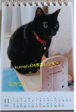 数日忌引きでお休みをいただいておりました。タイトルコールのペコは約10年前に、そしてトラも星になった今、ブログを続けるか悩んでいましたがこのままのタイトル&スタイルでトラの残してくれた可愛い娘たちの日常を綴っていこうと思います。ご心配をいただいた方々に御礼を申し上げますとともに、どうぞまた、よろしくお願いいたします。++++++++++霜月に突入しめっきり冷え込んできた今日この頃です。今月もいつものお披露目からスタートします。今月のkumaru04家カレンダーは、お誕生月であるミツコの当番です。食事の前はこうしてテーブルの上で待つ、食いしん坊♪この時も大きく(横に)なったな~と思っていたら、最近は益々…トラに食べさせるためにチュール等、カロリー高めのオヤツを与えていたら横から残した分を全部キレイにしてくれまして。何とかダイエットさせねば!と思っていても、お父さんがこっそりあげちゃうんですよね~おかげで絶賛増量中です(*_*)恐らく似たような境遇と思われる、イケメンシティボーイのチャチャ君。大人気地域猫だった当時は、色々な人達からチュールをゲットしていましたが、家猫生活ではそれなりに摂生されている模様。ありゃ、動物病院カレンダーは…チャチャ君の仔猫の頃でしょうか(*´艸`*)では、いつものごとく腹筋の準備をお願いしますね~えいっ!…(*´-ω・)ン?え~っと…これは鹿、ですよね?よかったぁ、一瞬トナカイかと思いました。まさか、ちゅーちゅーに限って前倒しだなどと~いやいや、シレっと右奥のホワイトボディはトナカイでは(^^:;しかもこの時季に蝶々って、一体どーゆーことですか(@_@;)ほんとに毎月…楽しませてくれますね♪続いては、間近に迫った11月場所が楽しみな大相撲カレンダーです。あらら、引退された方もいらっしゃいますが…これがカレンダー作りの難しいところですね~とはいえ、一年納めの九州場所です。既に今年の最多勝は横綱・大の里で決まりましたが、新関脇の安青錦や返り三役の王鵬と隆の勝などなど、楽しみな関取衆ばかりで、見逃せない取組ばかりだと思います(^^)お次のラグビーカレンダーは、フッカーらしからぬこの方。元・東芝ブレイブルーパス東京の原田衛選手です。残念ながら先月のネーションズカップでは、コンディション不良により代表を離脱していましたが、フッカーらしからぬスピードの持ち主です。体調を整えて、次の代表選に招集されますように。そして今月の〆も~確かに、推しがいました(*´艸`*)