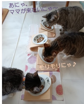 3姉妹で元気よく食べ始まったものの、母猫トラが来ないので…