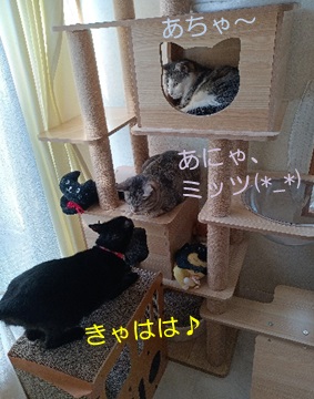 と、3にゃんは思い思いにタワーで待ちの体勢に。