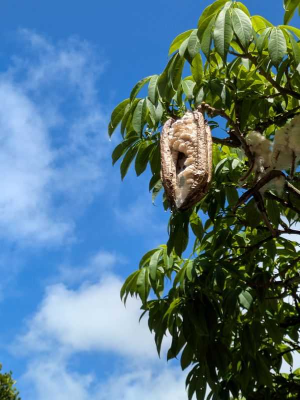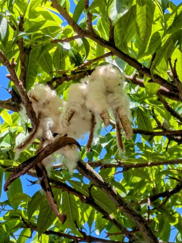ひと月ほど前、お庭のトックリキワタの木に実がなっていたお宅がありました。トックリキワタは結構あちらこちらにあって、桜のようなピンク色の花を満開に咲かせるので、私たちは「南洋ざくら」と呼んでいたのですが、個人的には実を見たことがなかったのです。