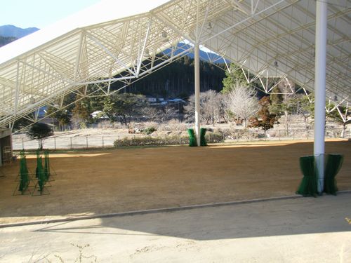 台風で被災しました、多目的施設ですが やっと3年越しで完成しました。 備品はこれからです。 下の土は調整不良というか、昔のままです・・・・・人工芝にしてほしかった感じがします