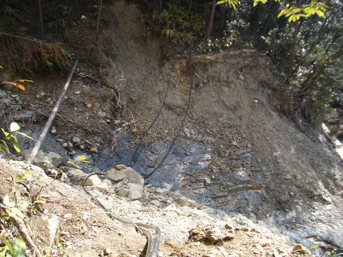 さて、本来の当館に来てました水道ですが、 先の台風で致命的なダメージを受け、現在は地元の民家への水道を借りている状況です。 で、もとの水道の状況ですが、徐々に復旧しつつあります。 今回は、その1箇所 この山崩れで、土砂ごとパイプが持っていかれたのです。 この写真は、新たなパイプをとりあえず渡した状態 そして、 ワイヤーロープでパイプを釣りました。 本日はここまで