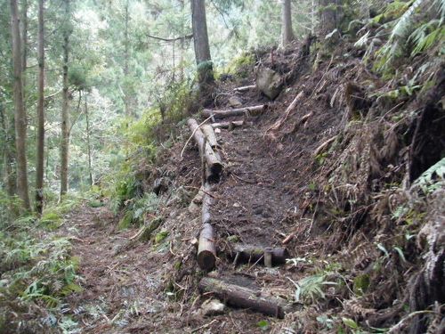 さて、昼食休憩です、 ちょっと風が吹くがいい天気なのできもちいい♪ ここからの景色をごらんあれ 遠くに大雲取山が見えるはずですが・・・ 確認できず さて、おなかも一杯になって、出発! あとは下りのみ ちょっと歩くと、 発見!!! ここが、八鬼山の山頂です。標高627mあります。 山頂からは少し下りになり、 ヘアピンの連続下り道 ここを下りて、 荒神堂を通り過ぎます。 この辺はなだらかな下り またまた奇岩を発見! 烏帽子石 と、 蓮華石 といいます。 見た目のとおり 朝見た雪が、 まだまだ残ってますね 尾鷲の町並みが見えてきた だんだん嬉しくなってくる が 最大の難所、七曲りです。 このような感じで延々とくだります。しかも急です。 逆ルートできた場合、地獄の登りになります・・・・・・ 膝を壊さないように、きをつけて だんだんと街が近づいてきてるのがわかります。 ここは開けていて、陽があたって気持ちいい なんだこりゃ? どうも上から岩の表面だけずり落ちたようです。 随分前にこうなったみたいさあ、ゴールは近い! もうひと頑張り! ついに到着!!!! 皆さんよく頑張りました!! 脱落者なしで、無事下山です。 でも、ここから車の場所までまだしばし歩かないと・・・ ただいま~ 所要時間は約4時間半(休憩含む)、 御疲れ様でした。 次回は是非会長を引き連れてこないと