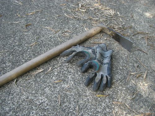 さて、この道具で、いったい何をするのか・・・・・・ そして、辺りを見まわすと・・・・・ わかったかな???? 今から、タケノコを掘っていきます。 上写真には、上と下の部分に2箇所ありわかるかな?? では、周りを掘っていきます。 大分下が見えてきたところで、トンガを一振り 一丁あがり