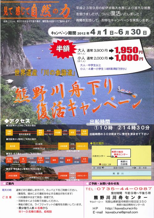 いよいよ4月1日より復活します! 再開を記念して、6月30日までの間、キャンペーンを実施で、 なんと! 運行代金が半額!!!!! 雲取温泉HPでも1泊2食の宿泊つきの川舟プランをご用意していますので、 当館HPからでもご予約できますよ