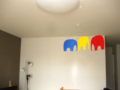 けっこう前にゲットしていたモビールのエレファントパーティー。うちはアパートなので画鋲を使えない。「さて、どうしようか」と、ずっと眠らせてましたが、このたび良い方法を思いついて決行!!!えっへ~ 照明のヒモにくくりつけてやったぜィ。風にユラユラ、ベビも楽しそうに見てるよ。嬉しいなんッじつは、気球もゲットしてますッ えっへ~。