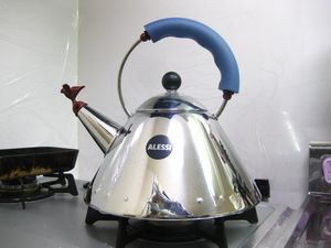 ケトルの中では、驚く価格のアレッシィのバードケトル。何度見ても美しいそのフォルムは、ケトルというより、美術品です。欲しくて欲しくて・・・買っちゃった。2年経った今でも見るとポワァ~としちゃいます。お湯が沸くと鳥が鳴いて教えてくれますよ。電気ポットも持ってますが、このケトルで沸かしたほうがおいしく感じますニューヨーク美術館・ホイットニー美術館などの設計士であり、数多くの賞を受賞したアメリカの工業デザイナー、マイケル・グレイプスがデザインしたバードケトル今ではホワイトやブラックもあるんですねぇ。