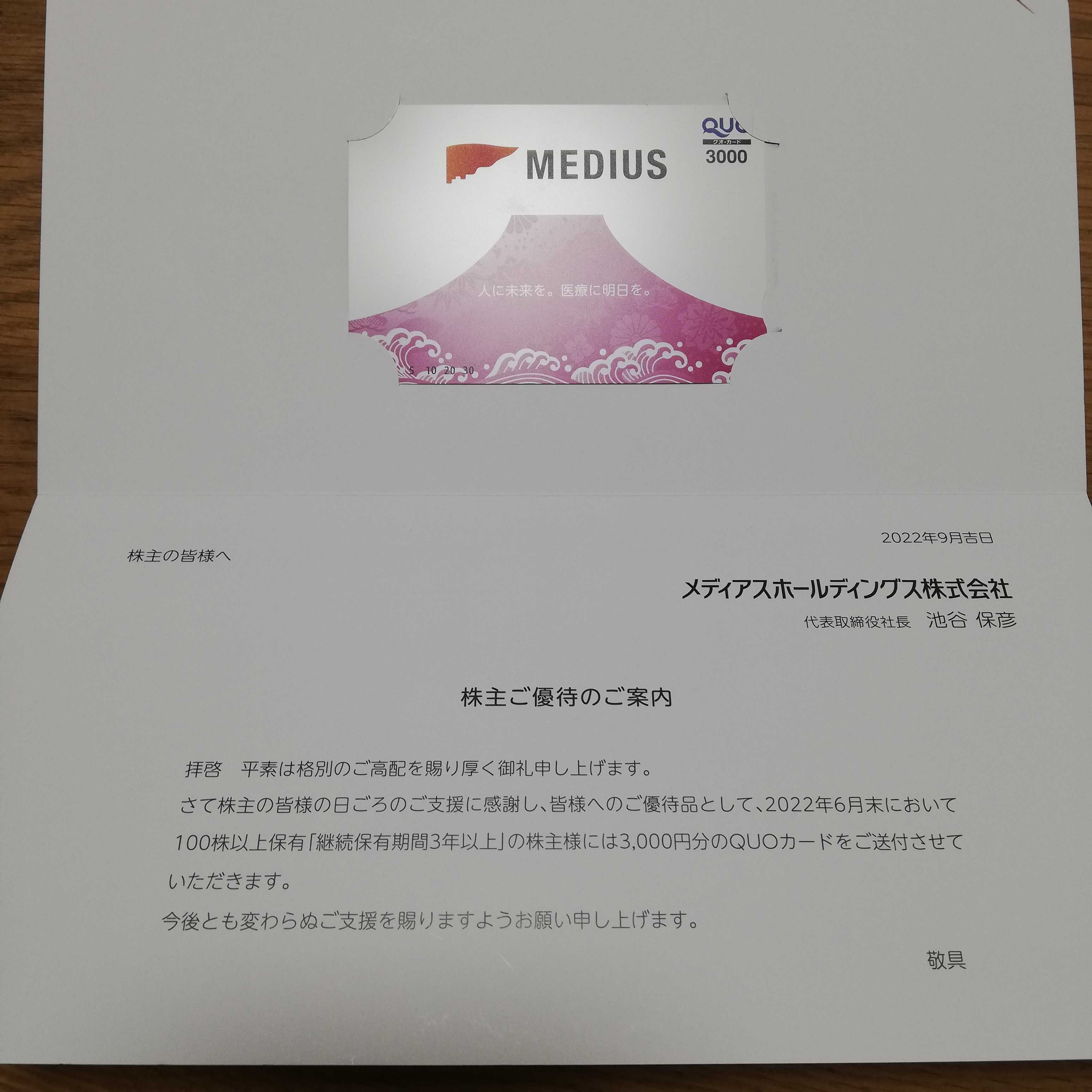 本日、メディアスホールディングスの株主優待が到着しました