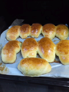 このところ、週末はパン作りに挑戦してる私。夕べはくるみパンに挑戦したものの、今ひとつ膨らまず・・・くるみは使い切ってしまったので、家にある材料でリベンジをしようとしてロールパンを作りにトライしてみた。ホームベーカリーなしでのパン作りをしてるんだけど、一次発酵でなかなか膨らまないのが、このところの悩み。でも今回はとりあえず、一次発酵の段階で二倍に膨らんだのでうまくいきそうな予感。ベンチタイム、二次発酵と無事に膨らんだものの、並べ方が悪くて、満員電車のパンみたいになってしまった。写真の奥の分は全部くっつきあってしまってロールパンというより長い一個のパン。でも出来上がったパンを割って中身を見たら、きちんと膨らんだ跡のある断面になってたのよしとしよう。色々作れるようになりたいんだけど、先は長いなあ・・・。ちょっとだけ、ころんにおすそ分けしちゃいました。