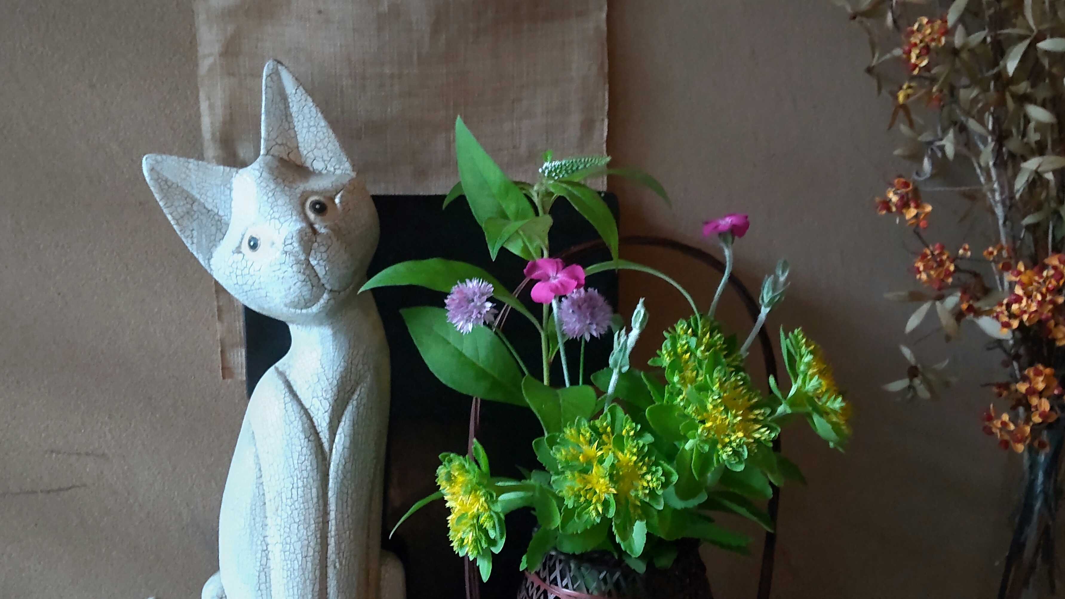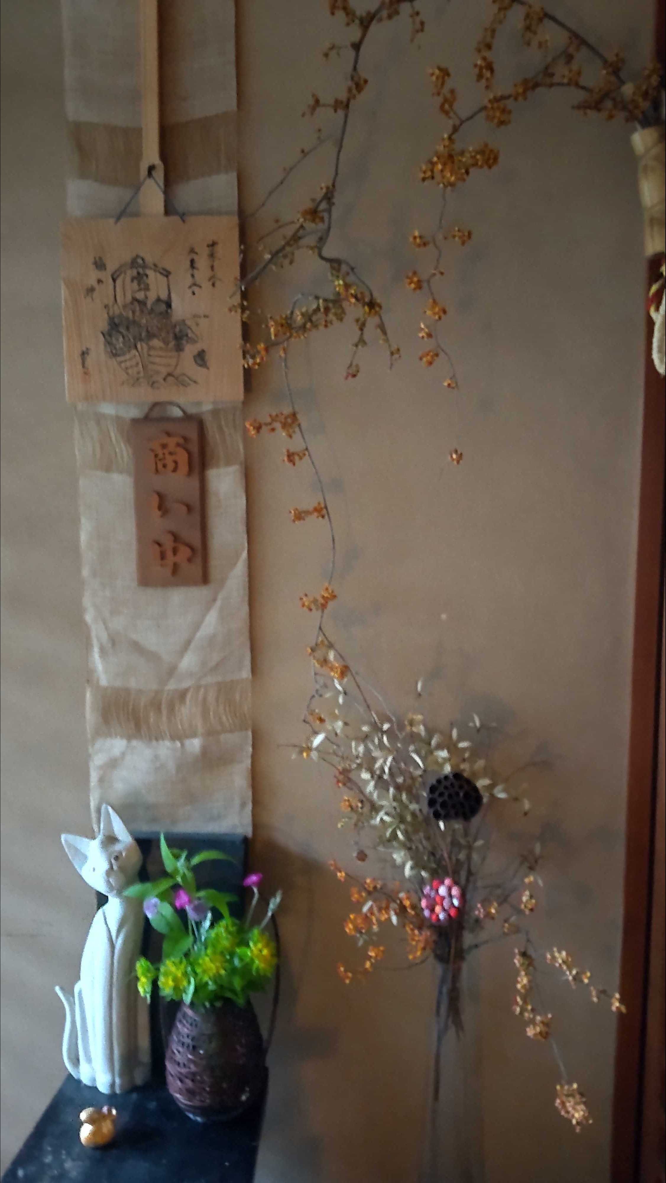 お帰りなさい!!今日も一日穏やかな日でしたコーヒータイムに立ち寄っていただくお客様がこれ!!と「季節の咲いている花を庭から持ってきた」嬉しいお土産でした氷水で水揚げし竹かごに生け変えました優しいお迎え花になりましたピラカンサスのドライフラワーも矢羽根のドライフラワーもその人が持ってきてくれたものです皆様のおかげでいろんな楽しみをお客様にできます